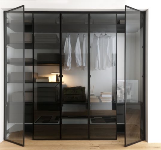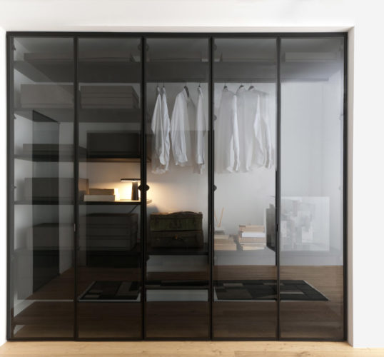 Solo redefines room partitions and wardrobe functionality. Solo’s simple design makes configuring space an easy task, and its uses go beyond mere shelving and storage: it can act as a freestanding practical room partition, a shelving solution for a kitchen or office space, or a walk-in wardrobe for bedrooms. Paneled in either glass or wood, with minimalist handles and hinges, the Solo wardrobe stands out as both a piece of interior functionality and design.